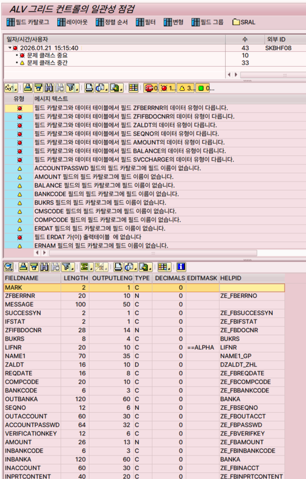 SAPGUI에서 ALV 화면 빈 공간에서 커서를 두고 Shift 키를 누른 상태에서 마우스 오른쪽 버튼을 두 번 연속 클릭해 보세요. 평소 어렵게 확인했던 'ALV 그리드 컨트롤의 일관성 점검' 창이 즉시 나타납니다.